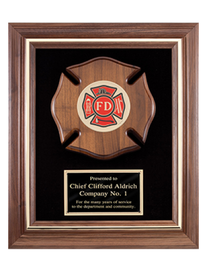 A walnut finish frame with inlaid gold detail perfectly complements the wood Maltese cross and engraved plate on a Black Velour matting.