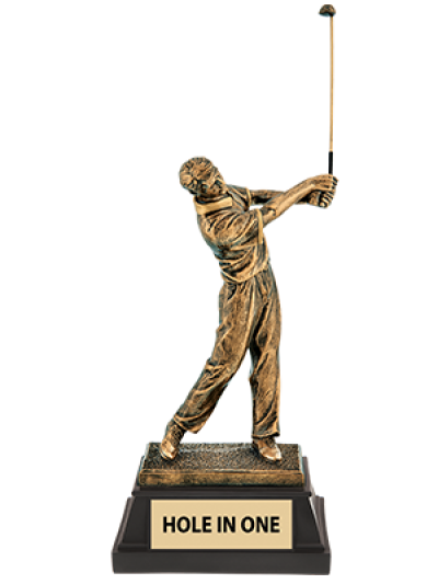 This impressive award features a detailed resin sculpture of a male golfer, captured at the peak of his follow-through.